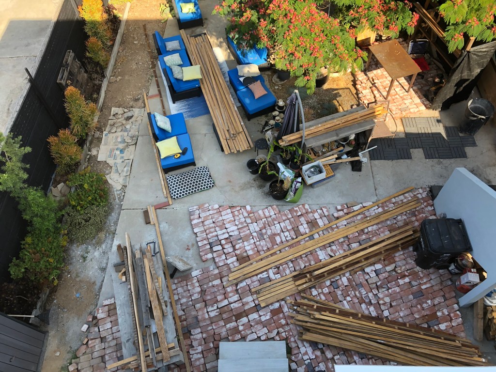 I don’t believe that my neighbors are sitting at their windows with a bowl of popcorn waiting to see what I am up to. Though I wouldn’t blame them as I have been moving the 10 to 20-foot long joists that used to support the back portion of our house that was originally built in 1909. Or the up to 15-foot spans of old hardwood flooring that I was hoping to reuse, only to acquiesce to the simplicity, timeliness, and inexpensiveness of buying a new laminate flooring. I have determined to use these materials in the backyard to keep them from winding up in the land fill.